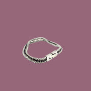 A mix of texture and shine, this bracelet is designed with two woven silver-tone chains and a geometric clasp. Its flexible, lightweight feel makes it a versatile staple for daily wear.