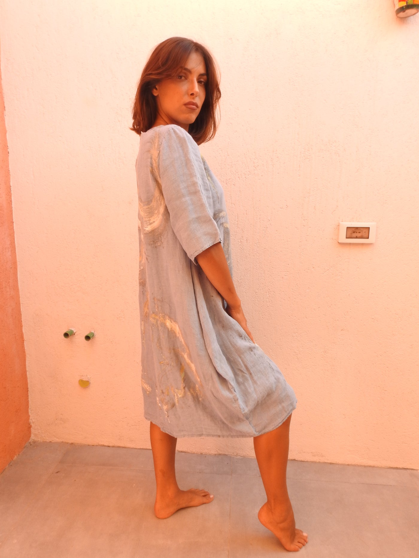 This unique one-piece blue dress features hand-painted floral designs, offering a distinctive style that combines artistic expression with wearable fashion. The intricate artwork ensures that each piece is one-of-a-kind, appealing to individuals seeking originality in their wardrobe.Italy