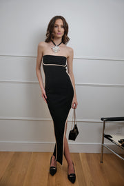 Step into sleek sophistication with the “Graphic Seduction” bandeau dress by Saints & Secrets. Crafted in deep noir and framed with bold beige piping, this body-hugging silhouette redefines minimalist drama. The structured bandeau neckline and sculptural fit create a striking contrast, while the thigh-high side slit adds a sultry surprise to your every step. Zipped in the back for a seamless finish, it’s made for nights when you want to command the room without saying a word. Think old-Hollywood glam with a contemporary twist, made for the daring dreamers. Pair with strappy heels, bold eyeliner, and the confidence of a fashion icon.