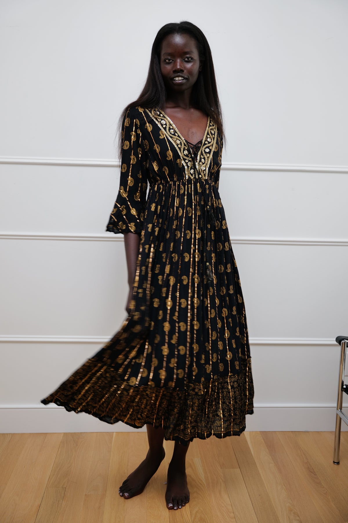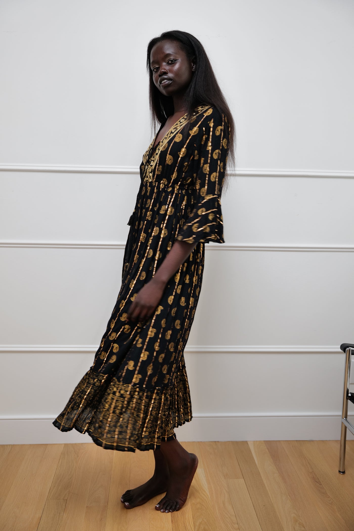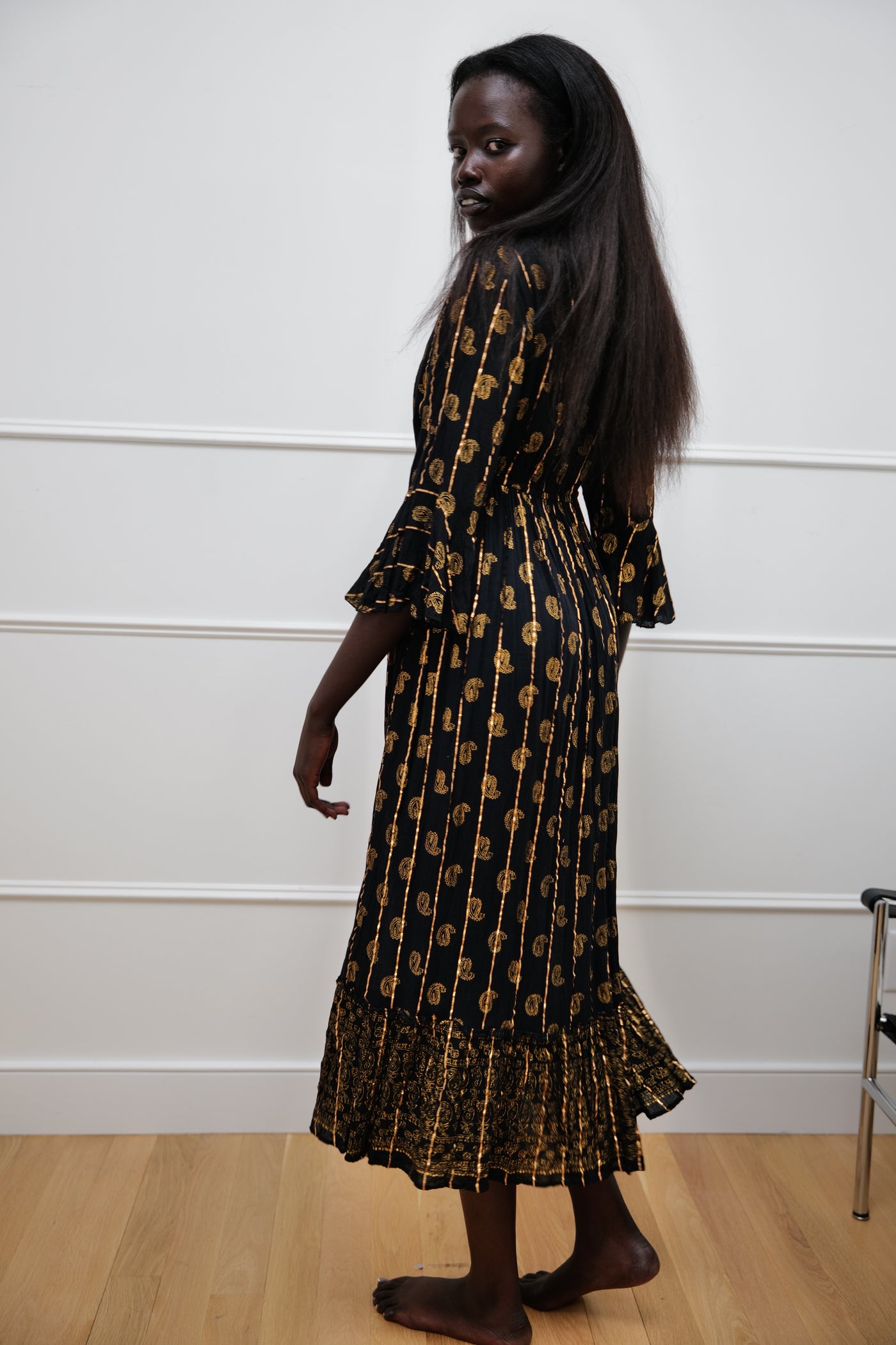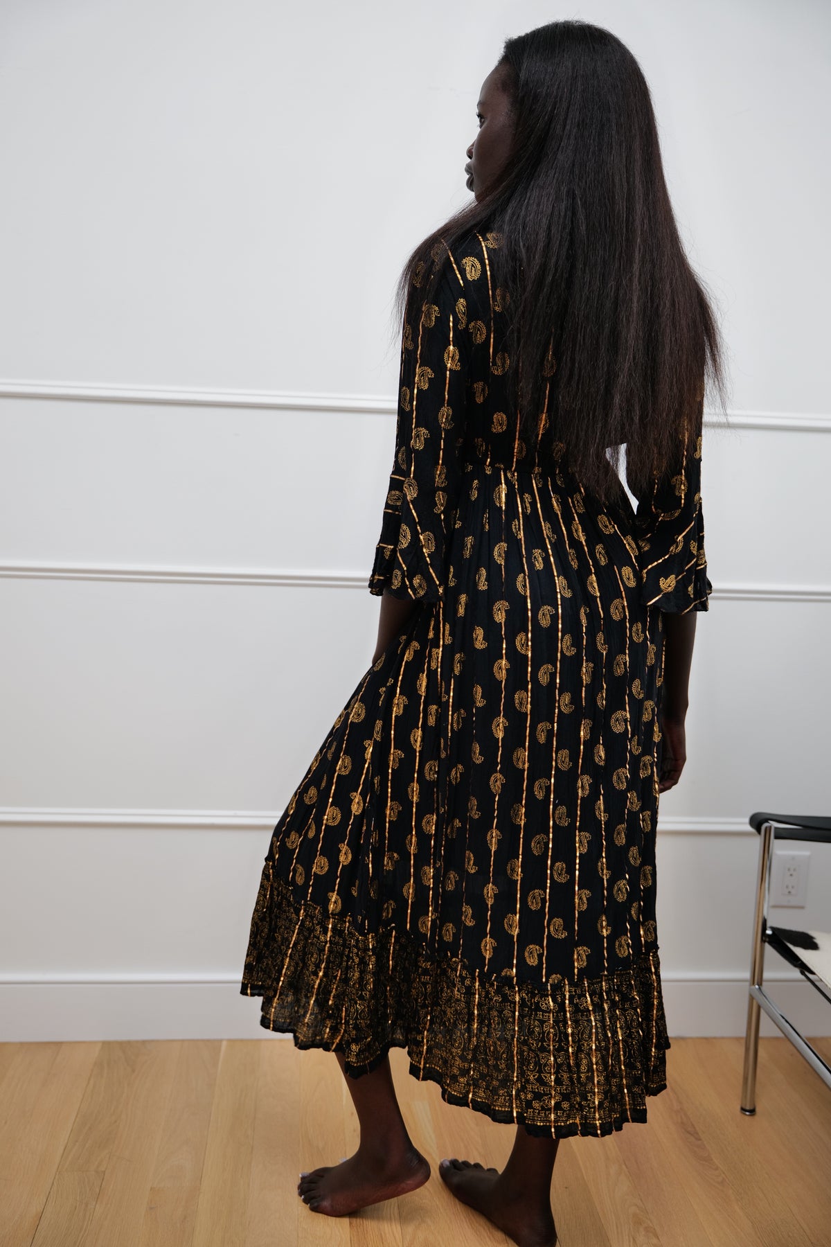 Step into a dream woven in black and gold. The Midnight Muse Dress by Indian Emporium is a masterpiece of heritage-inspired elegance, featuring golden paisley and vine motifs embroidered on flowing black fabric. The smocked upper bodice flatters your silhouette, while the V-neckline and front-slit detail add a bold, contemporary twist. Whether you're strolling through a festive market or making an entrance at an evening soirée, this dress moves with you, catching every ray of light. Rooted in cultural richness and elevated by artisanal flair, it’s an iconic piece in La Bottega di Layla’s globally inspired wardrobe. A true collectible.