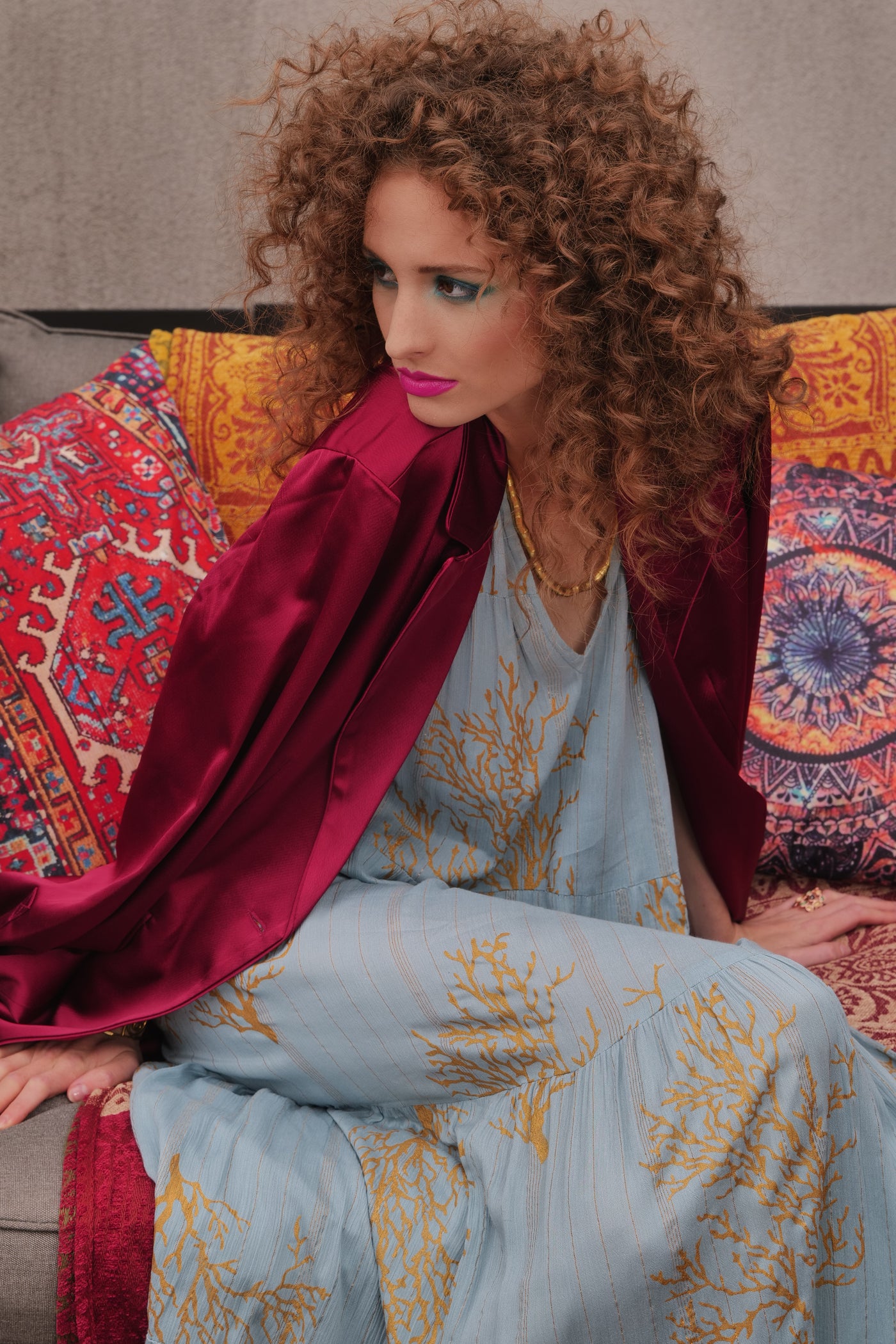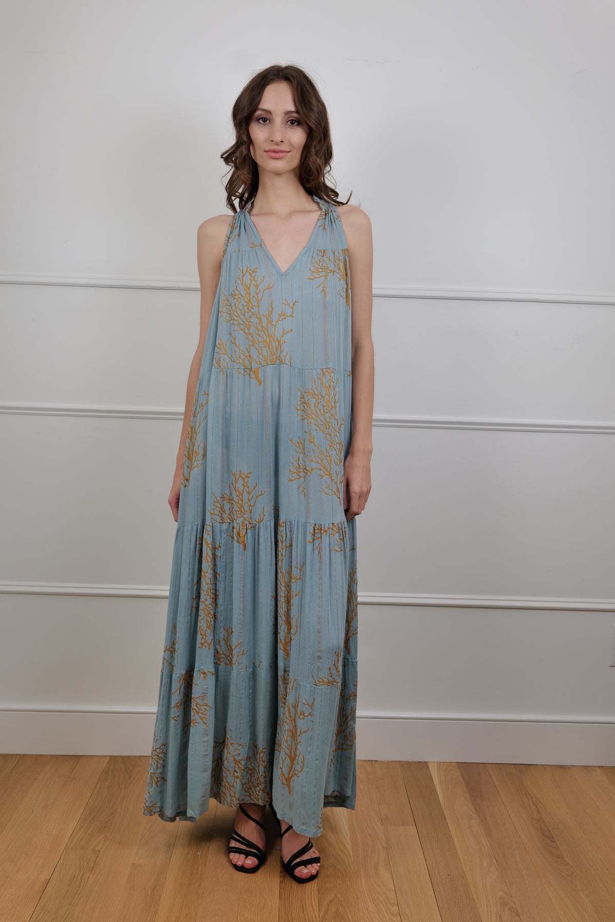 Channel oceanic serenity with the Sea Whisper Maxi Dress by Free Limes, curated for La Bottega di Layla. Crafted in a soft aqua blue with delicate golden coral motifs, this flowing sleeveless dress evokes Mediterranean summers and coastal elegance. The flattering V-neckline and softly pleated tiers add effortless movement, while the halter-style collar with a playful tie detail nods to breezy, barefoot escapes. Whether you’re wandering along seaside markets or attending a sun-drenched soirée, this dress brings the magic of the sea with you.