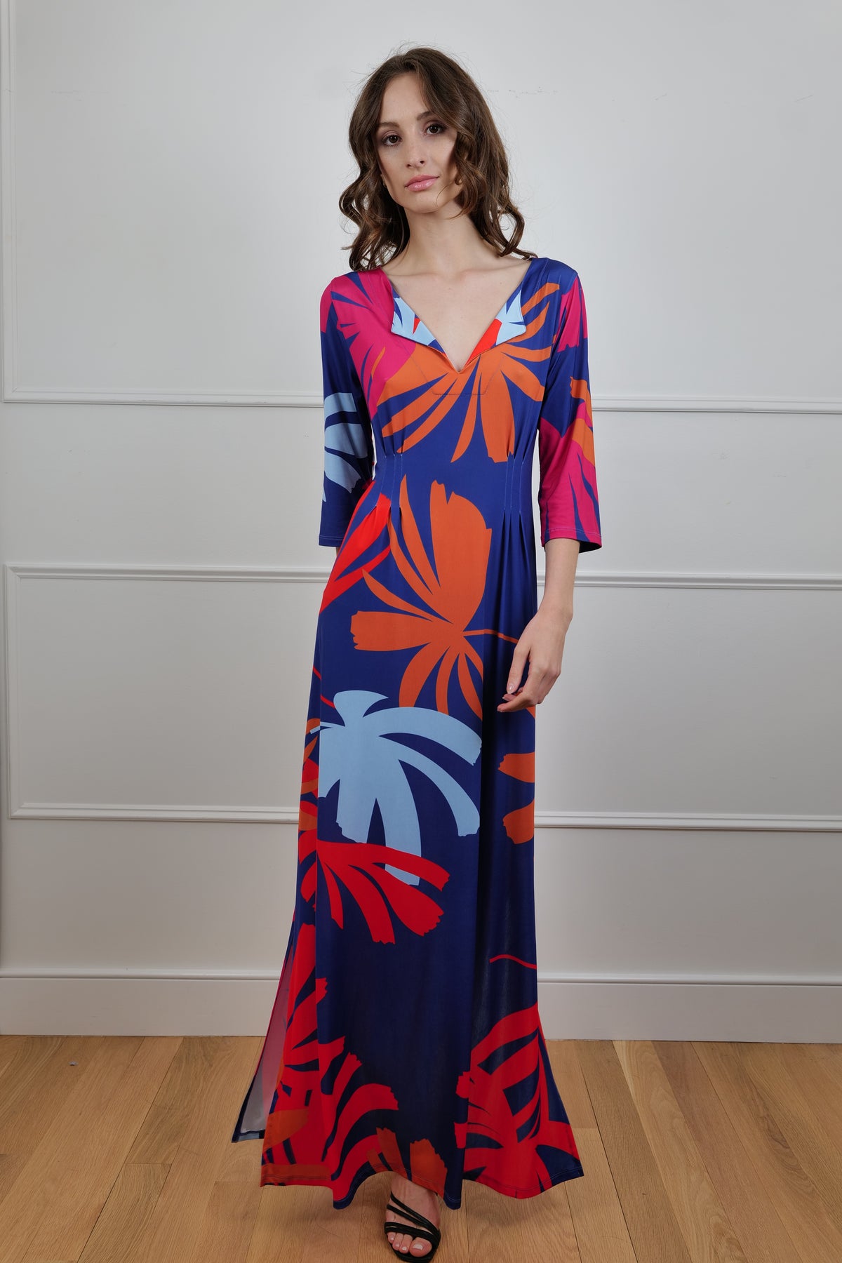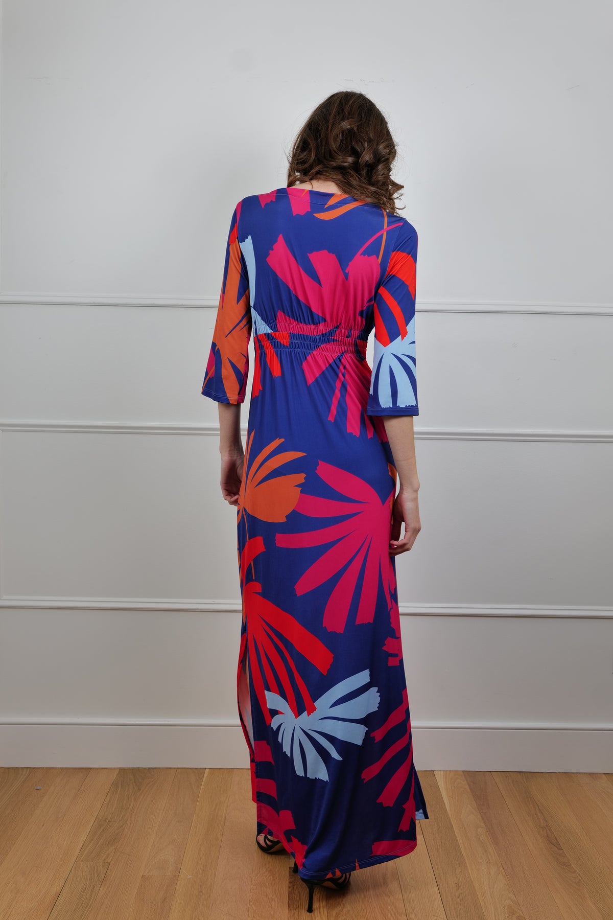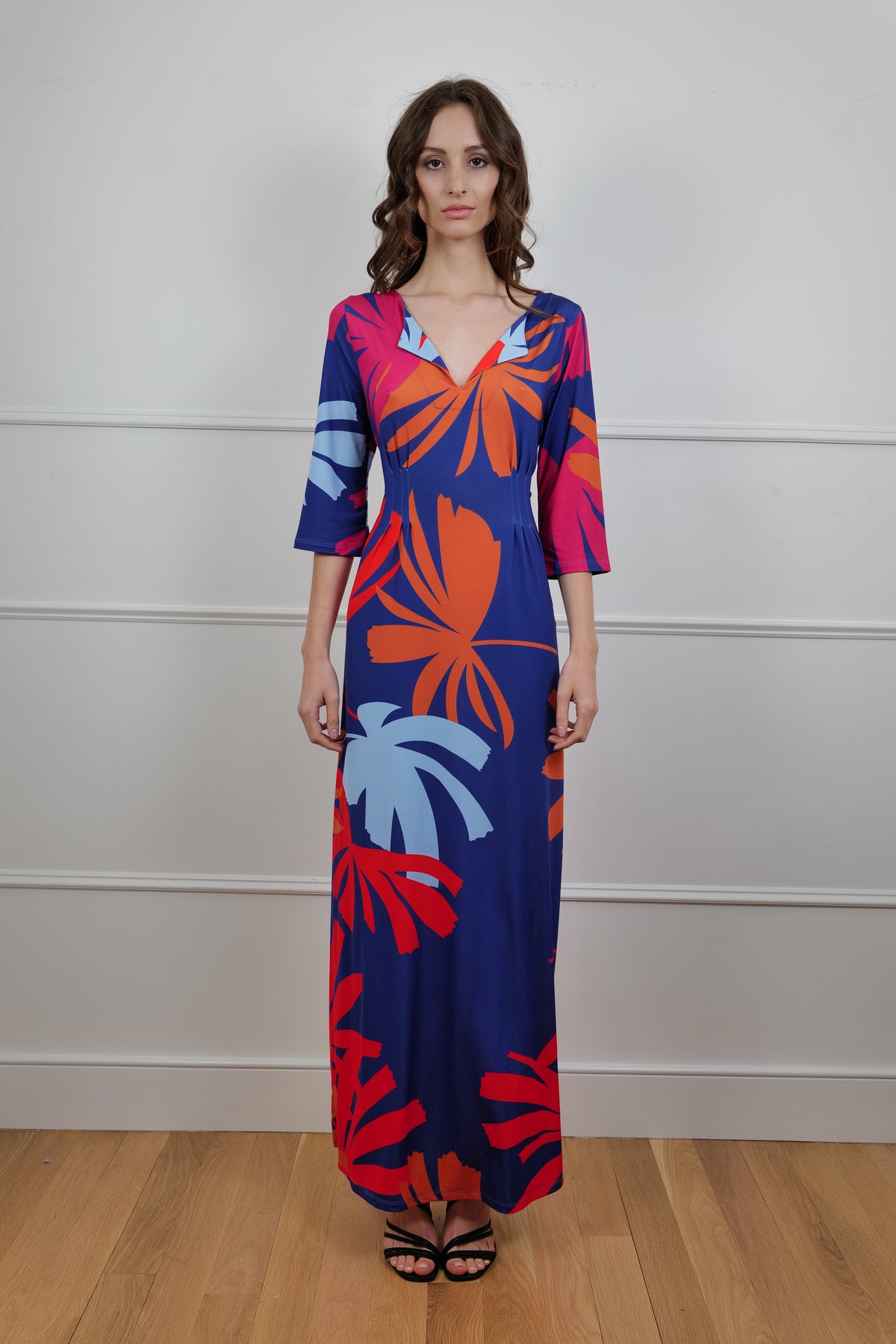 Dare to stand out in the “Tropical Blaze” dress by La Bottega di Layla, a bold body-hugging maxi infused with island energy and runway attitude. Crafted in a soft, stretchy fabric that flows with your every move, this vibrant piece features a riot of oversized tropical leaves in electric reds, corals, and powder blues set against a deep navy canvas. The long sleeves and subtle scooped neckline add balance to the vivacious print, making it ideal for both beachside cocktails and city soirées.
