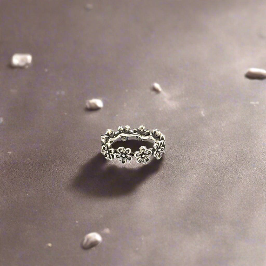 Celebrate carefree elegance with this charming floral band ring. Crafted in silver and adorned with dainty embossed flowers all around, it’s a playful and versatile piece that adds a whimsical, boho twist to your style—beautiful solo or in a ring stack.