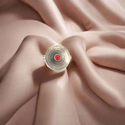 A tribute to bold tribal aesthetics, this silver ring features fine concentric engravings that draw the eye to a vibrant red central stone. Striking and full of character, it’s perfect for those who love jewelry with meaning and attitude.