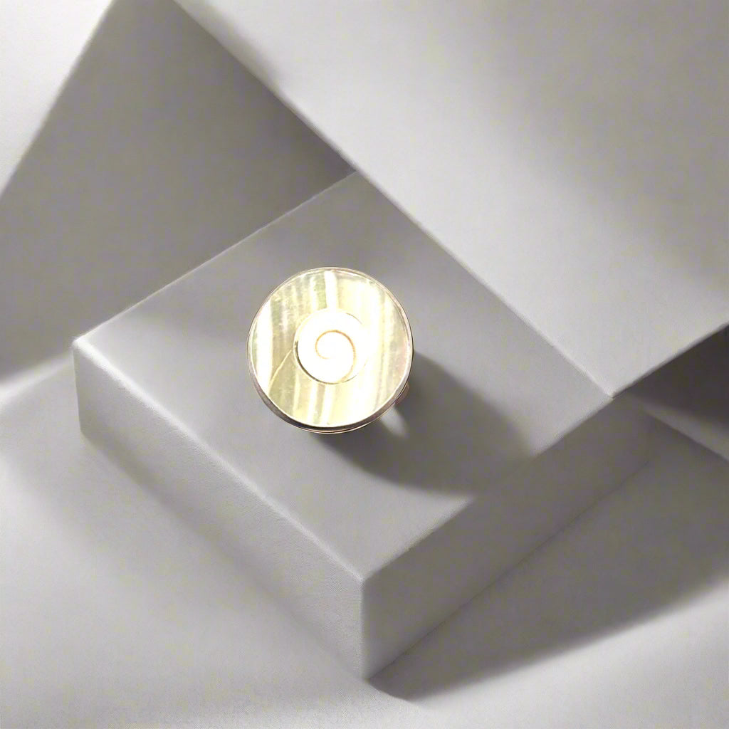 A gleaming mother-of-pearl disc, engraved with a minimalist swirl, makes this ring a refined nod to the ocean. The polished wooden band offers warmth and texture, making it a chic, understated accessory for dreamers and wanderers alike.