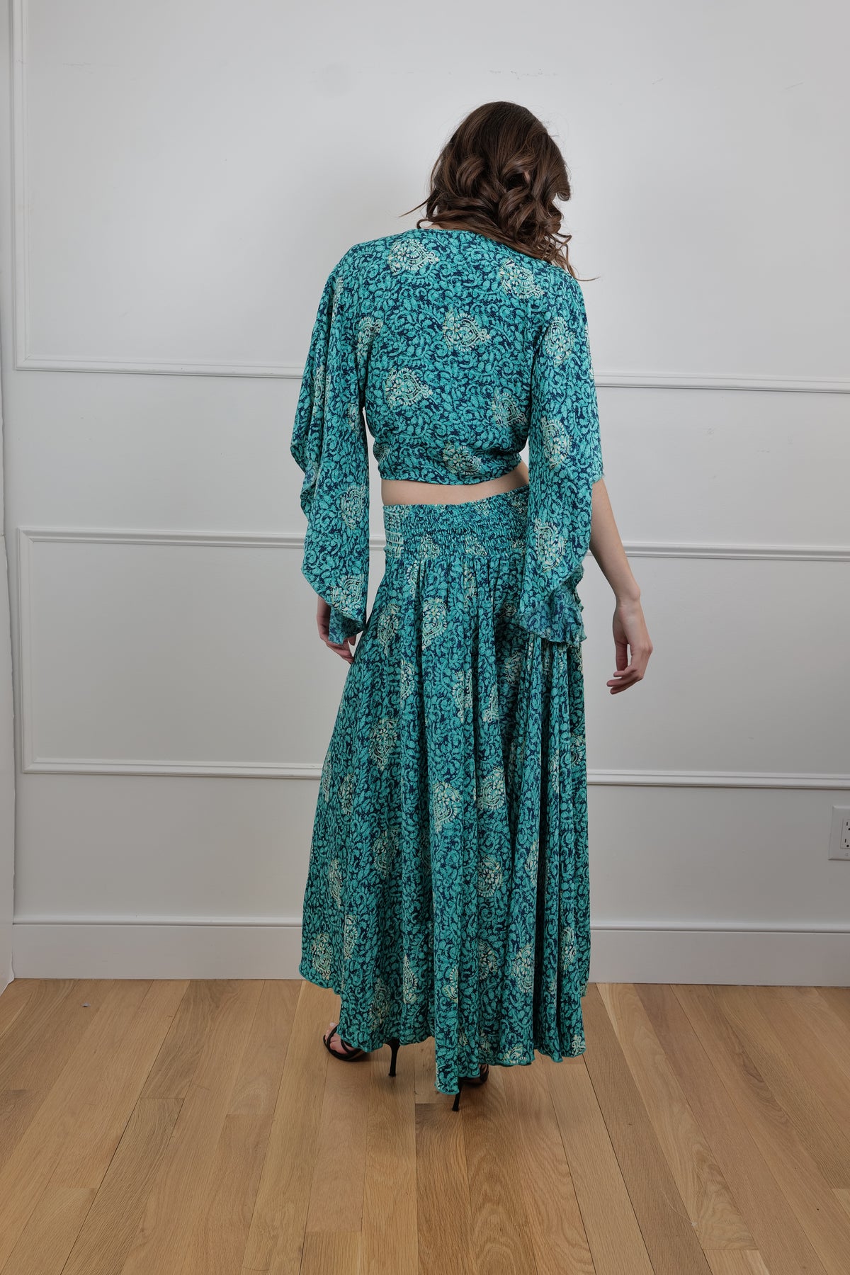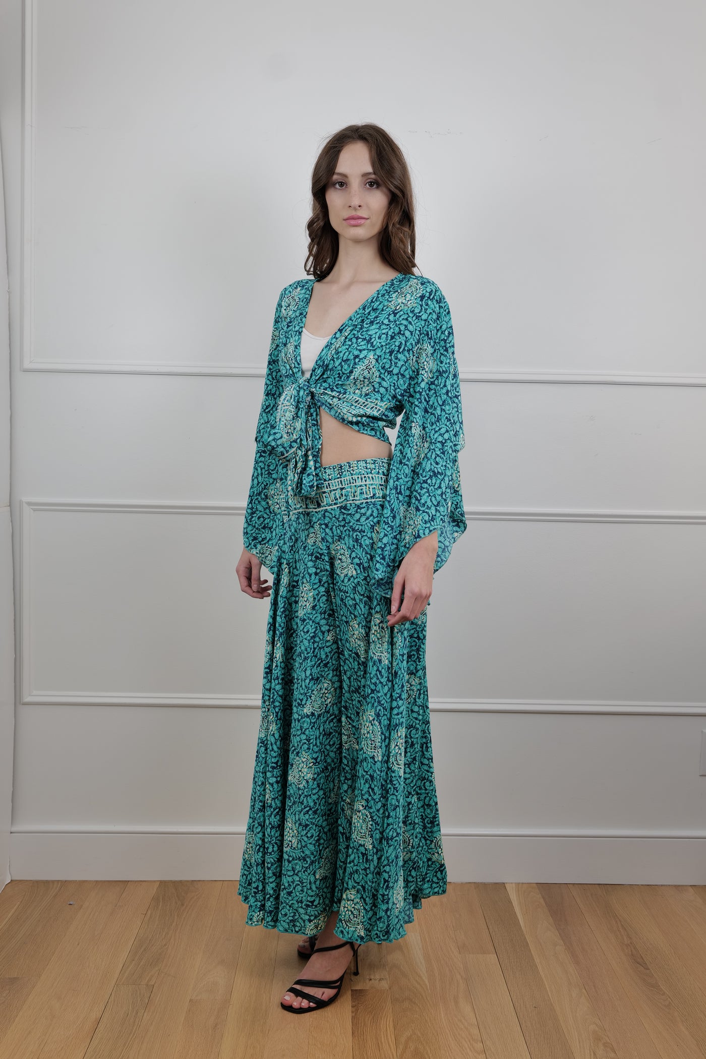 Dive into effortless boho elegance with the Bohemian Breeze Top by Free Limes. This teal-toned set captivates with its intricate print inspired by Mediterranean tiles and desert florals, offering a head-turning palette of turquoise and cream. Featuring dramatic batwing sleeves and a long fluid pants suitable for fun occasions. The soft drape flatters all silhouettes, while the lightweight fabric ensures a breezy, comfortable wear from morning markets to moonlit dinners. A statement piece that embodies La Bottega di Layla’s love for expressive fashion and wanderlust charm. Pair it with high-waisted denim, linen trousers, or a flowing maxi skirt for a look that’s equal parts bold and poetic.