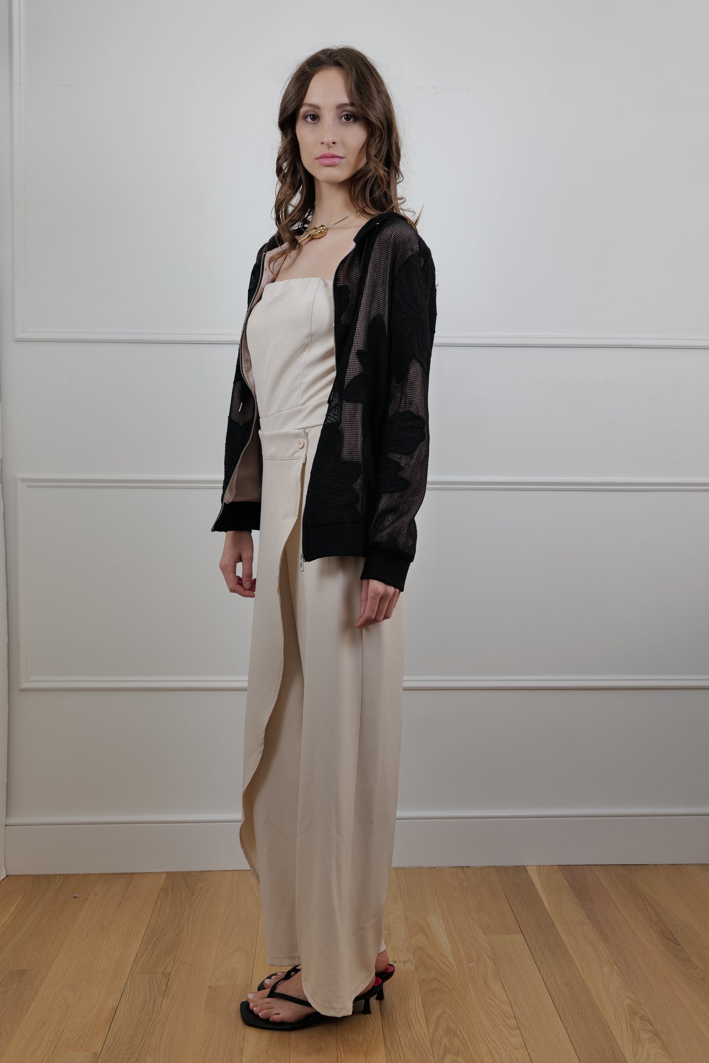 Delicate meets daring in this sheer black mesh jacket by Avec Les Filles. Embroidered with oversized tonal florals, it’s a soft rebellion — where femininity takes on an edge. The pale blush lining peeks through the transparent fabric, offering a layered, romantic effect. Whether layered over a slip dress or styled with jeans, this piece speaks to the modern woman who embraces contrast and nuance in her wardrobe.