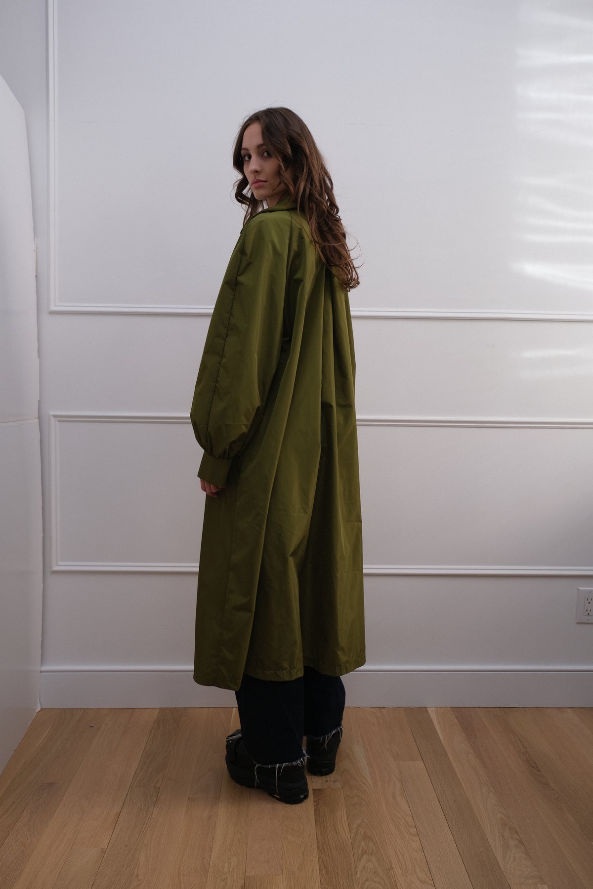 Grey skies, meet great style. The “Tempesta” raincoat turns rainy days into runway moments. With its sleek matte finish, utilitarian design, and oversized silhouette, it offers both comfort and attitude. Statement pockets, a cinched waist, and snap-button details make it as functional as it is fashion-forward.