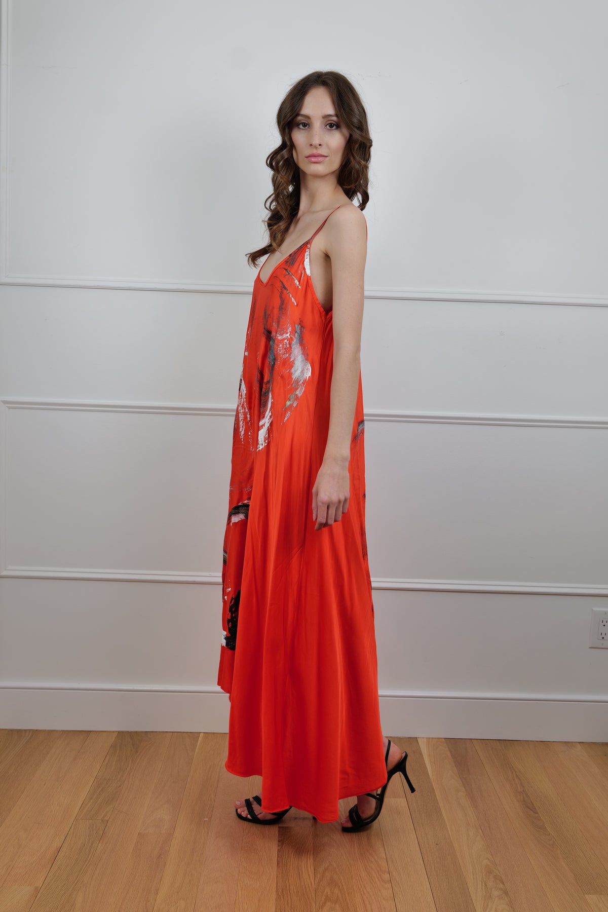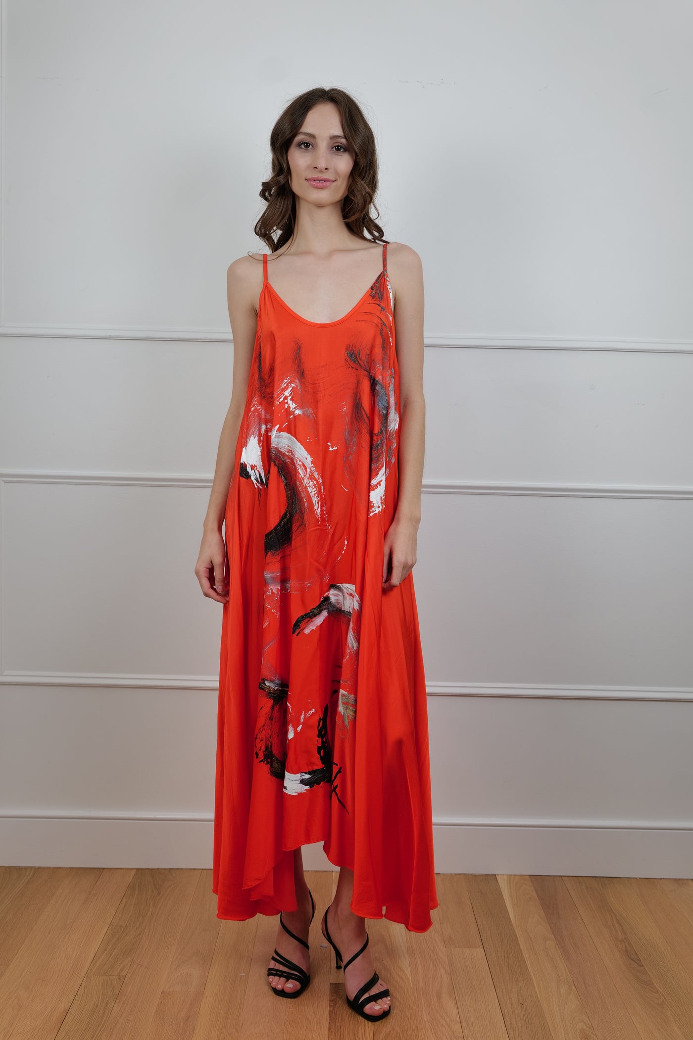 Make a statement in this show-stopping satin maxi dress by One Only For You. Crafted in a fiery orange hue with a fluid, draped silhouette, this dress is more than just fashion, it’s wearable art. Bold hand-painted brushstroke motifs dance across the front in black, white, and grey, creating a powerful contrast against the silky sheen of the fabric. Lightweight and effortlessly glamorous, it features slender straps and an elegant high-low hem. Wear it barefoot on the beach or with heels at a rooftop soirée, either way, you’ll turn heads.