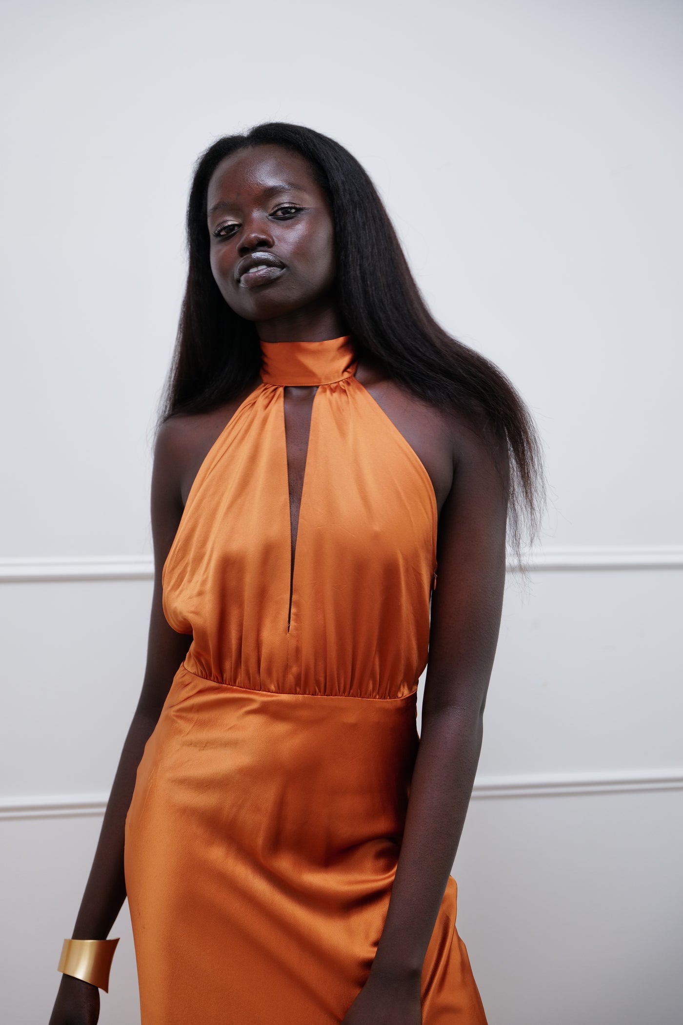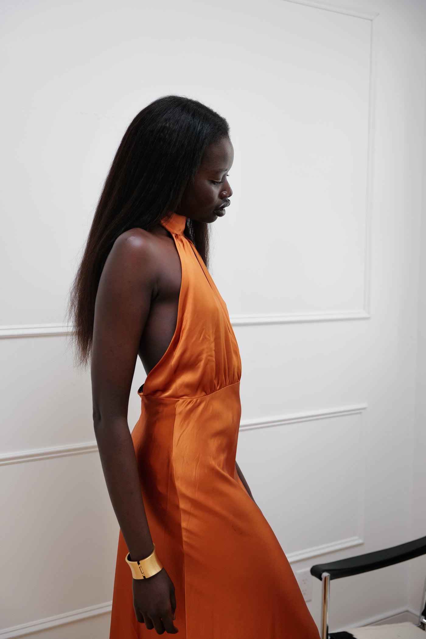 Turn heads in every light. The preloved “Sole Bruciato” pre-owned dress by Something Navy stuns in rich tones of bronze, burnt orange, and gold, glowing like a summer sunset. Designed with an open back and an adjustable halter-style neckline that ties like a statement necklace, this dress drapes beautifully across the body with both freedom and elegance.